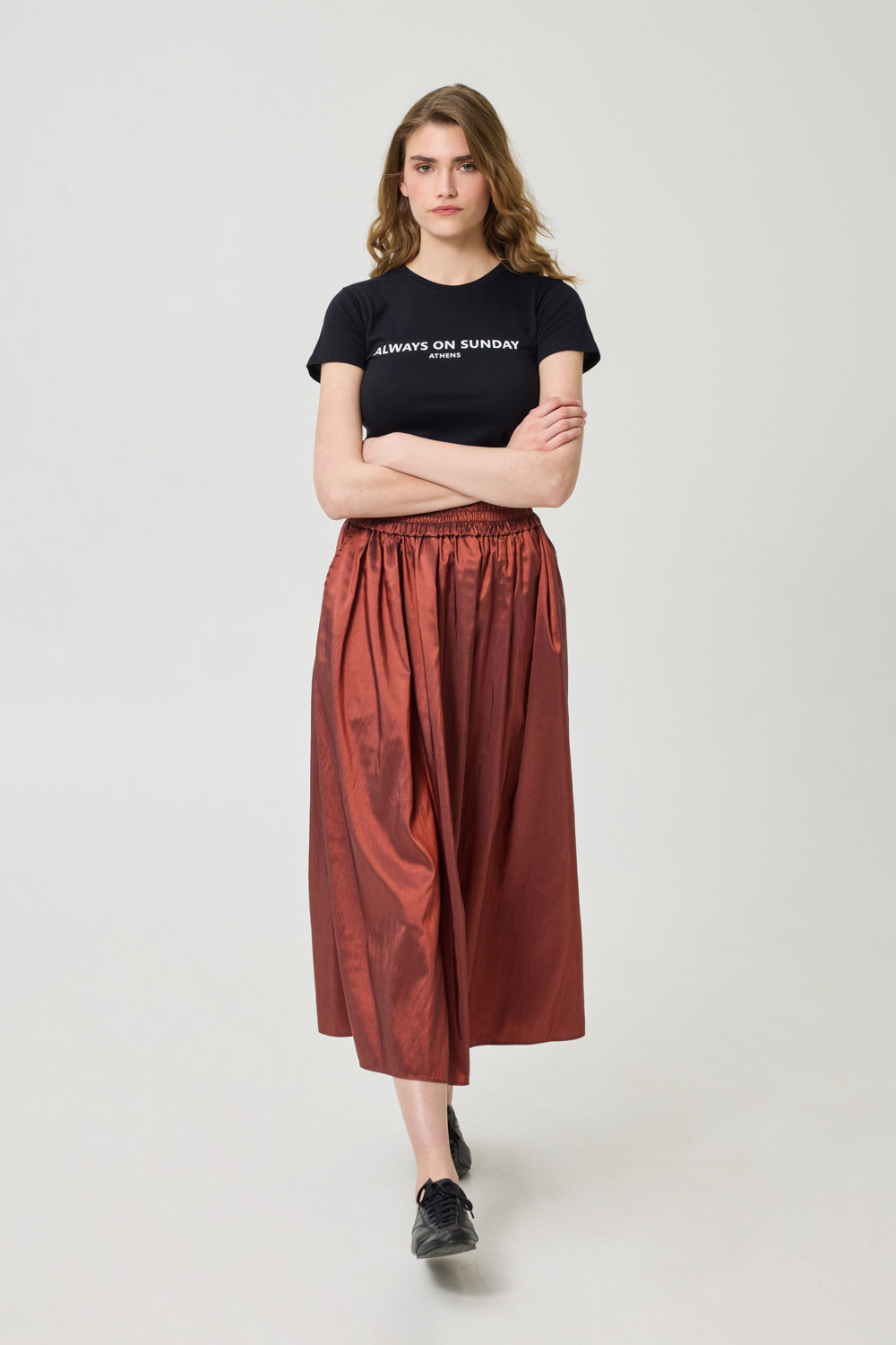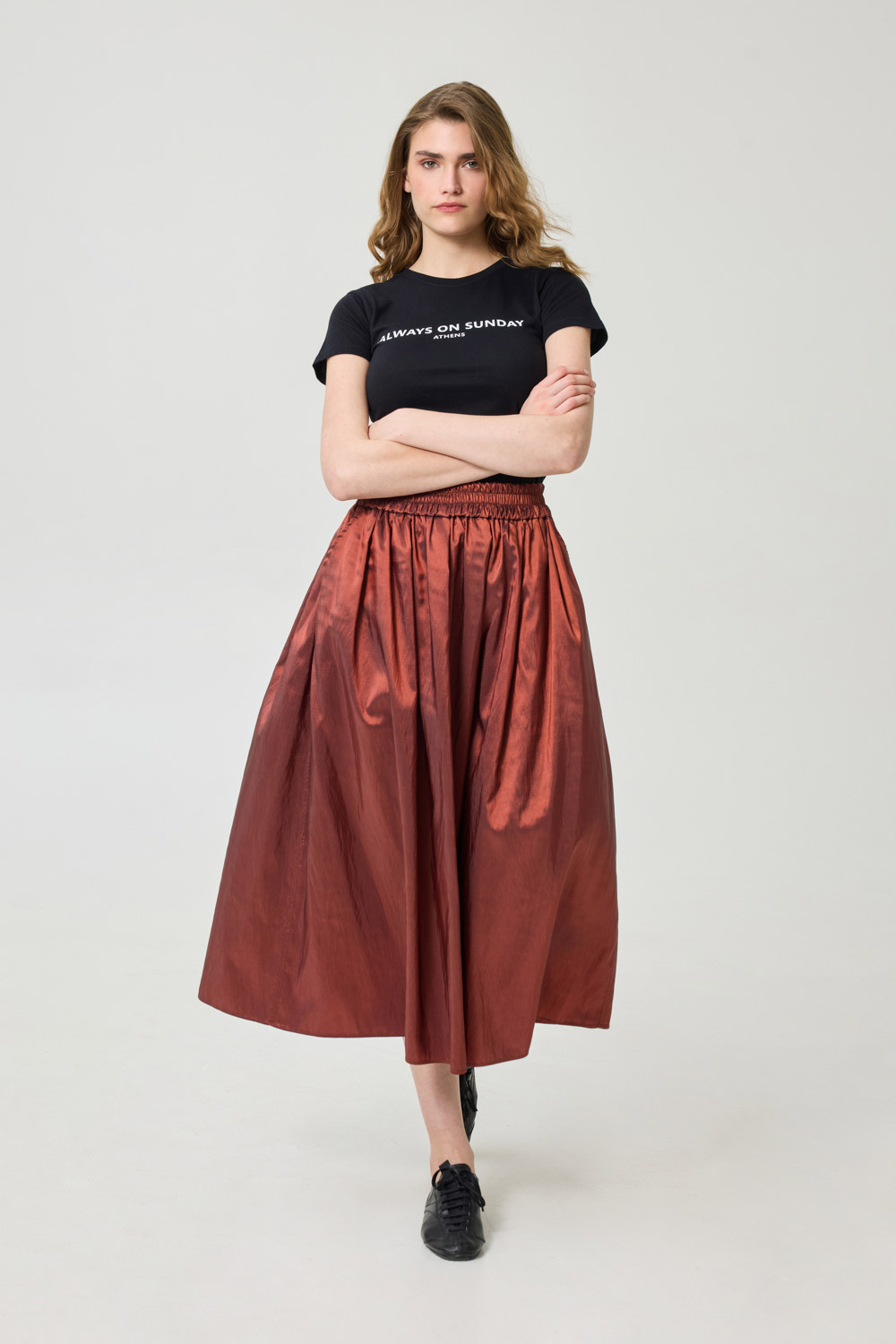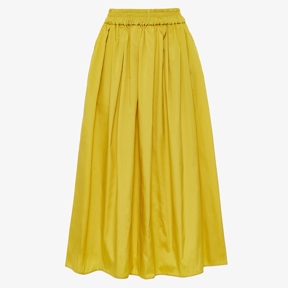 Midi, high-waisted taffeta skirt with pleats in the front / Hidden side pockets / Elasticated waistband / Relaxed silhouette