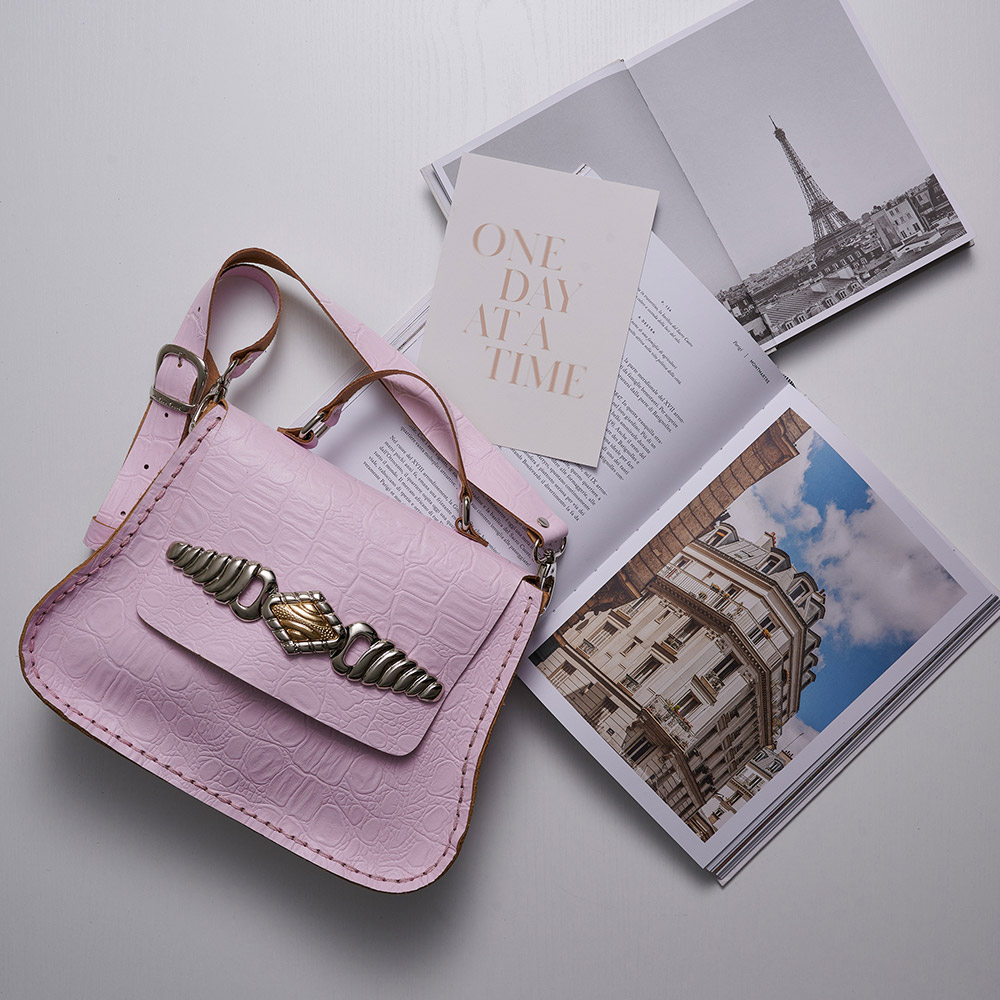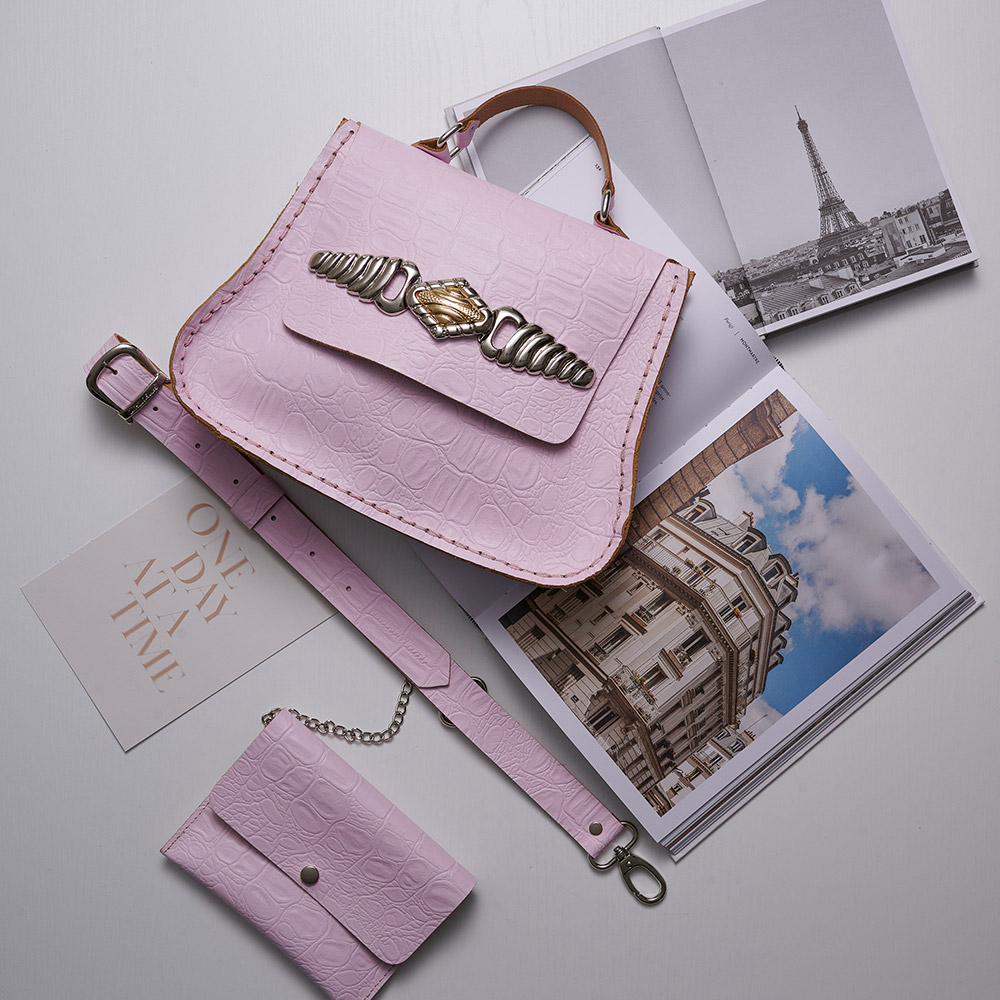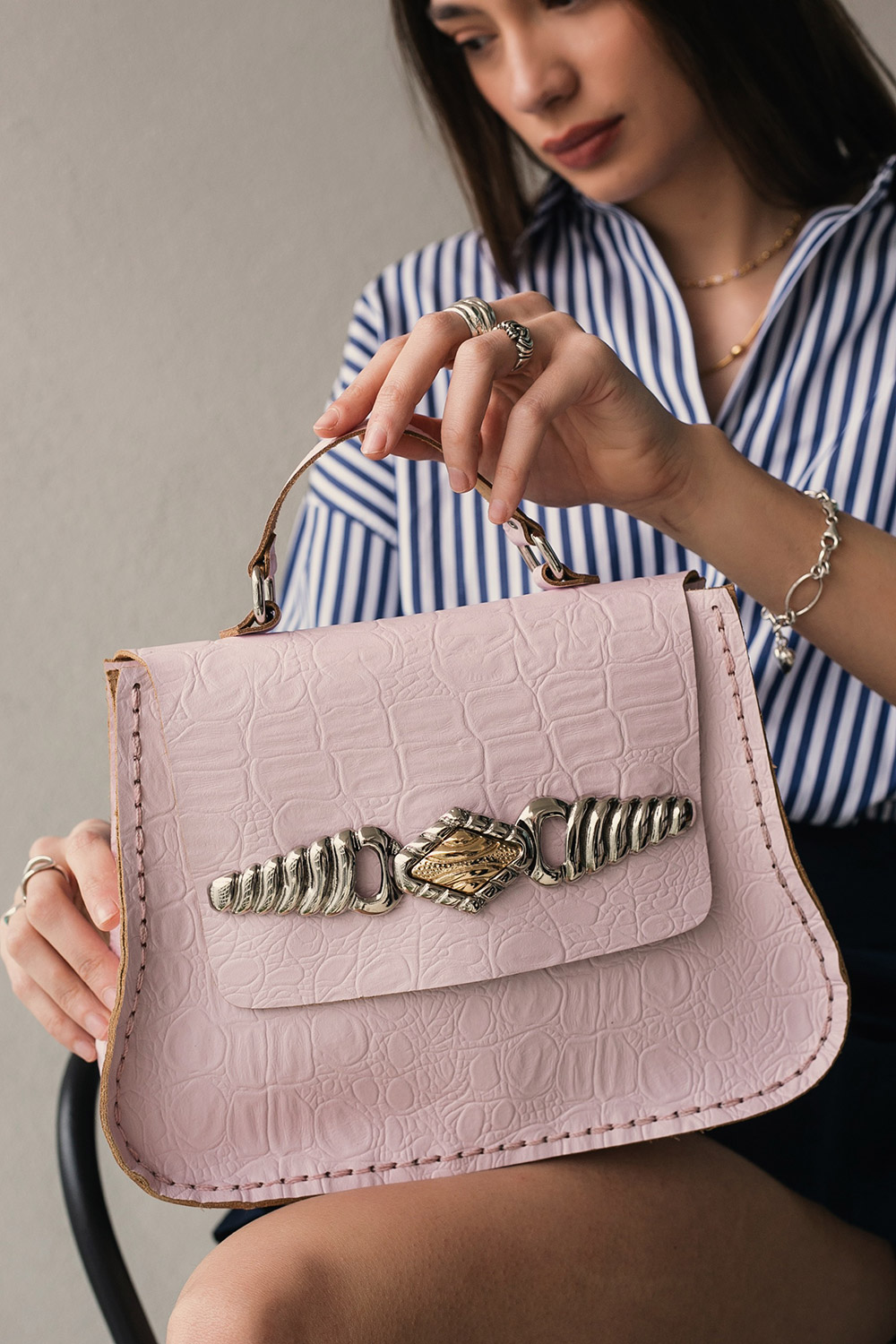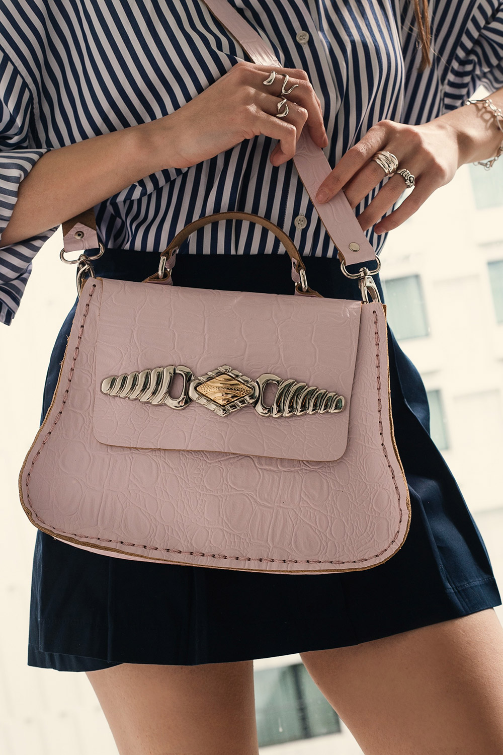 Handcrafted leather shoulder bag with carved nickel or gold metal details / Adjustable leather strap / Contains removable leather wallet / You can always wear it as a handbag