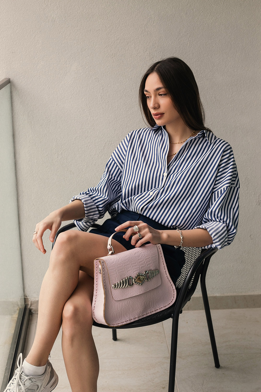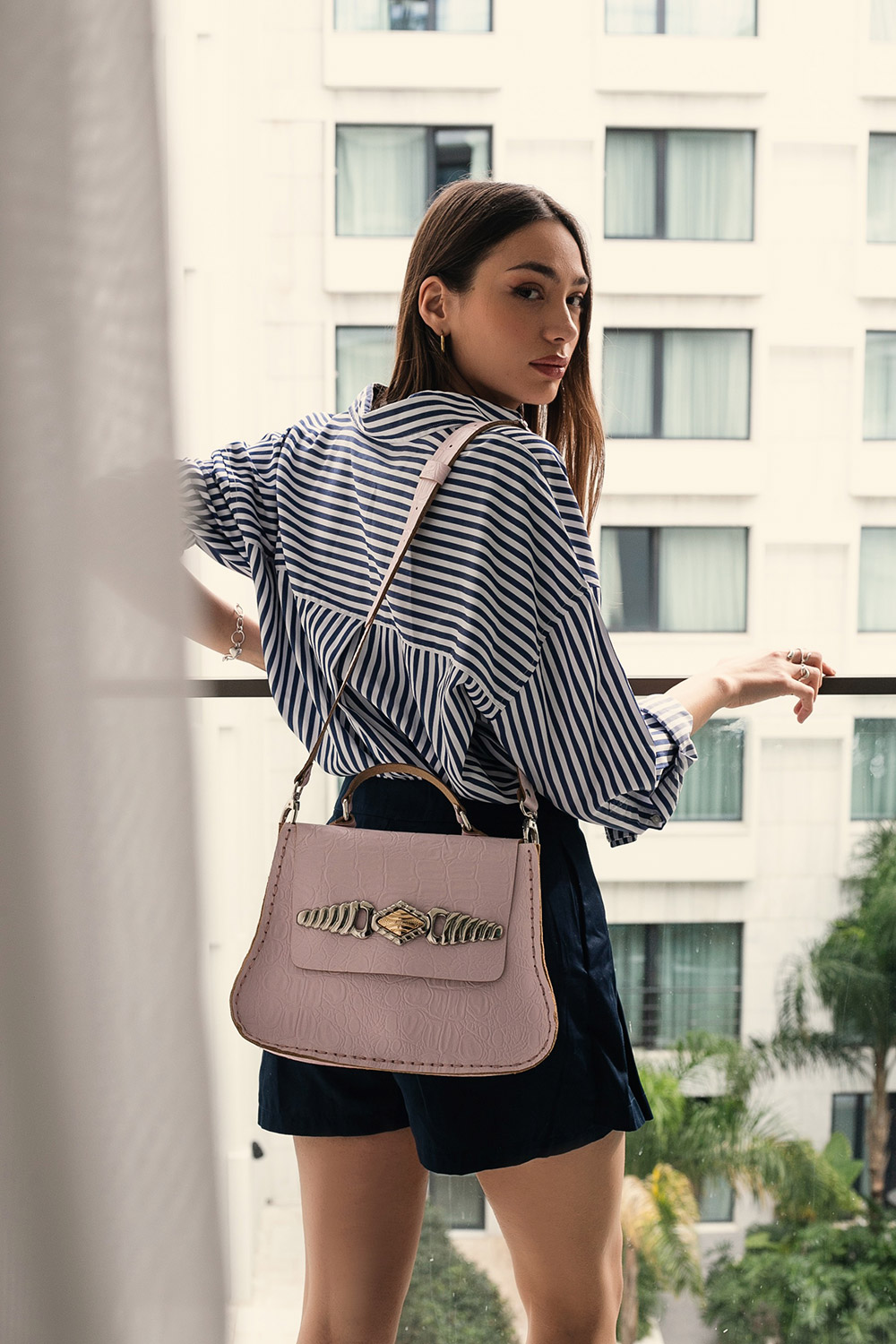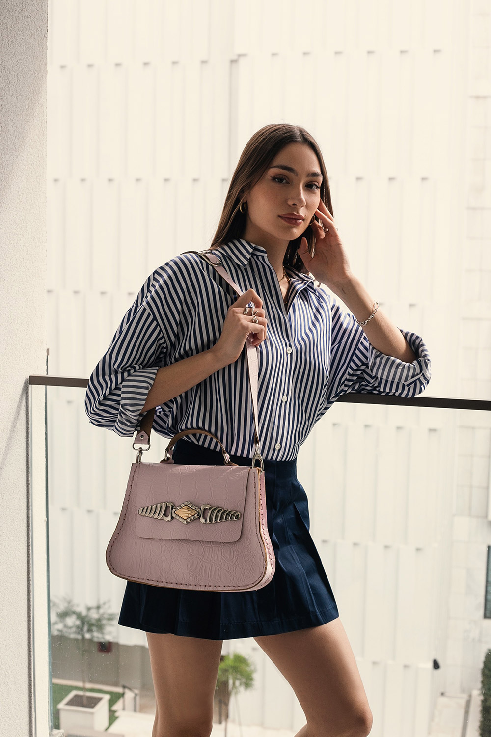 Handcrafted leather shoulder bag with carved nickel or gold metal details / Adjustable leather strap / Contains removable leather wallet / You can always wear it as a handbag