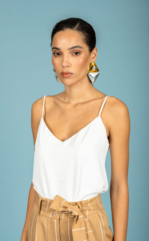 Sleeveless, structured, relaxed fit top / Closed round neckline / Belt included