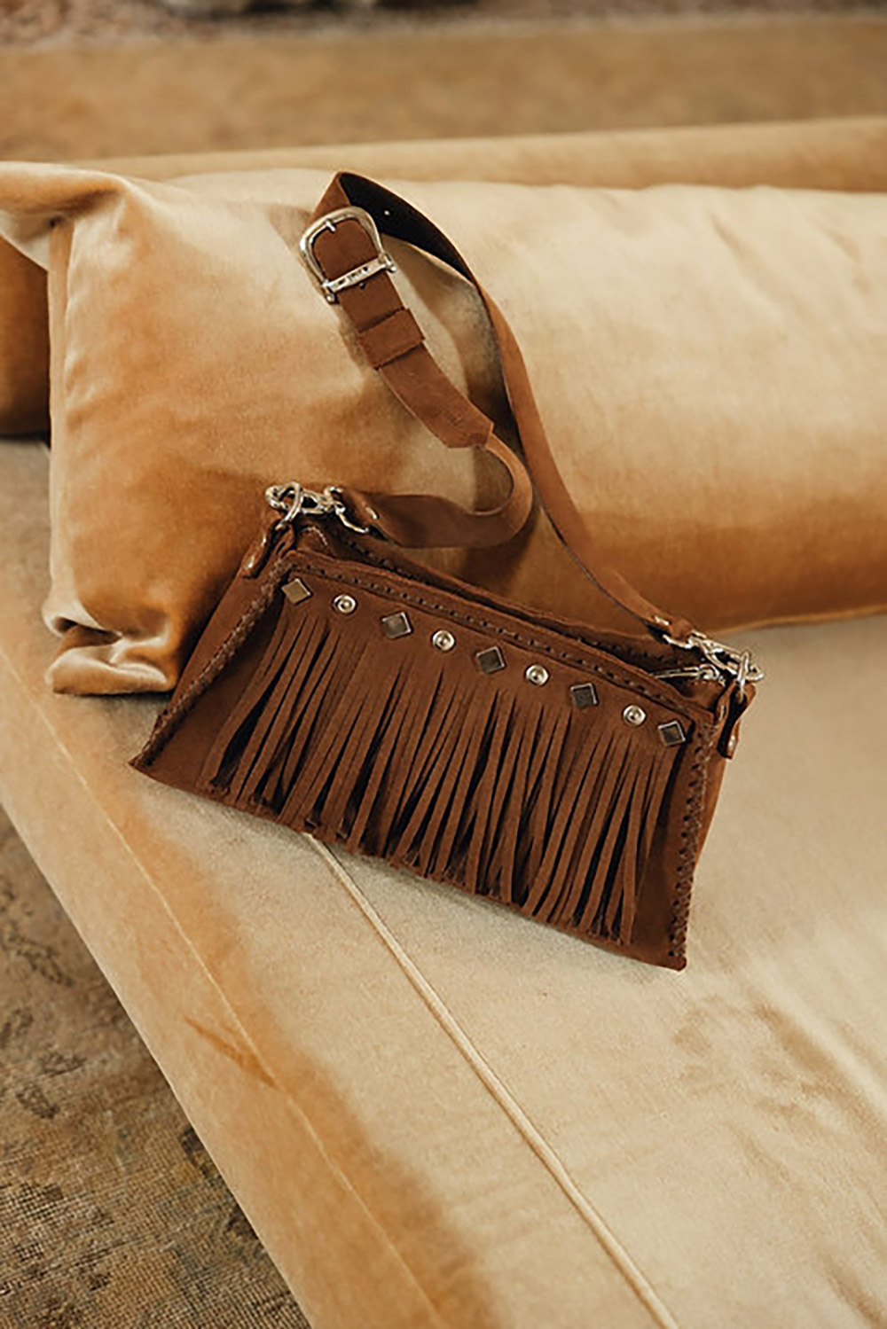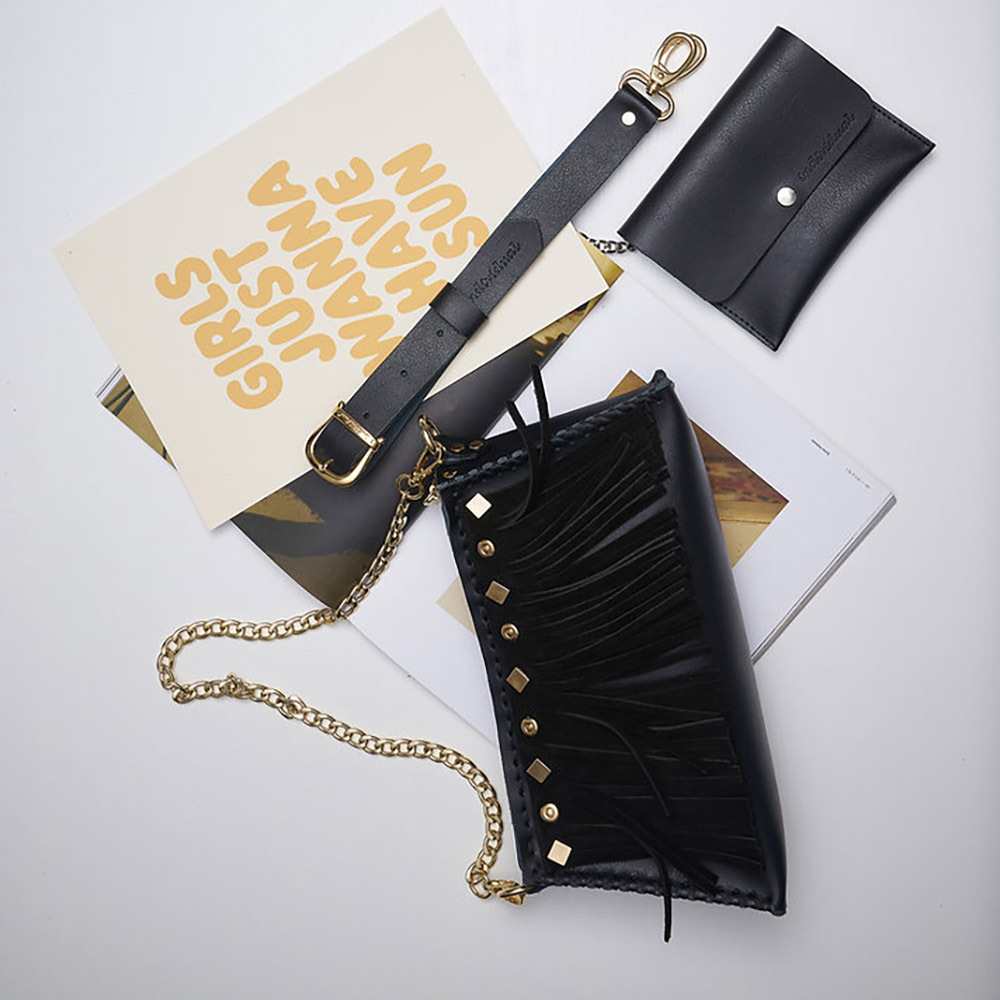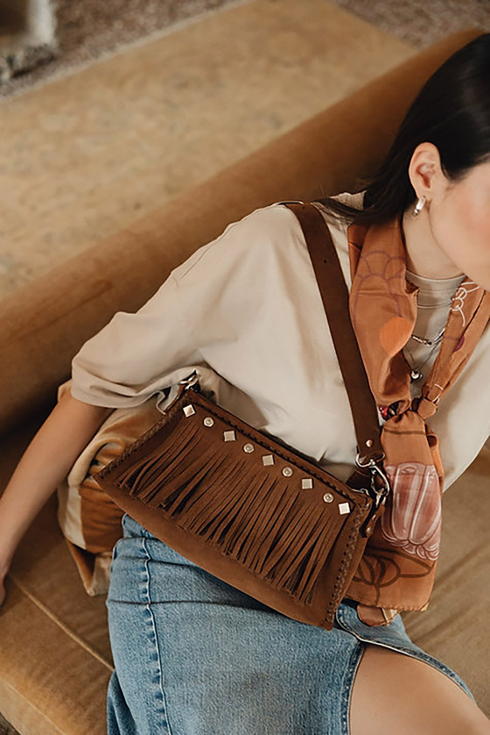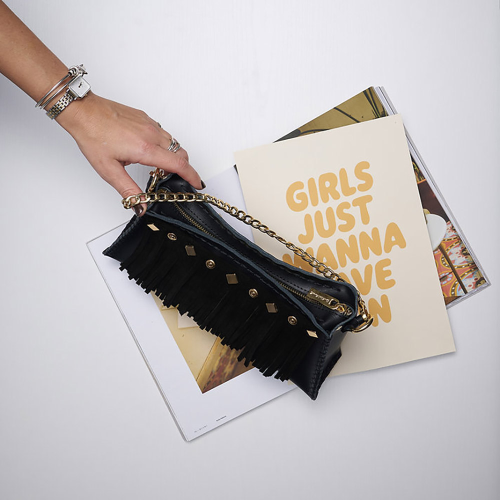 Handcrafted leather shoulder bag with carved gold or silver metal details / Comes with two straps (one leather, one chain) / Contains removable leather wallet