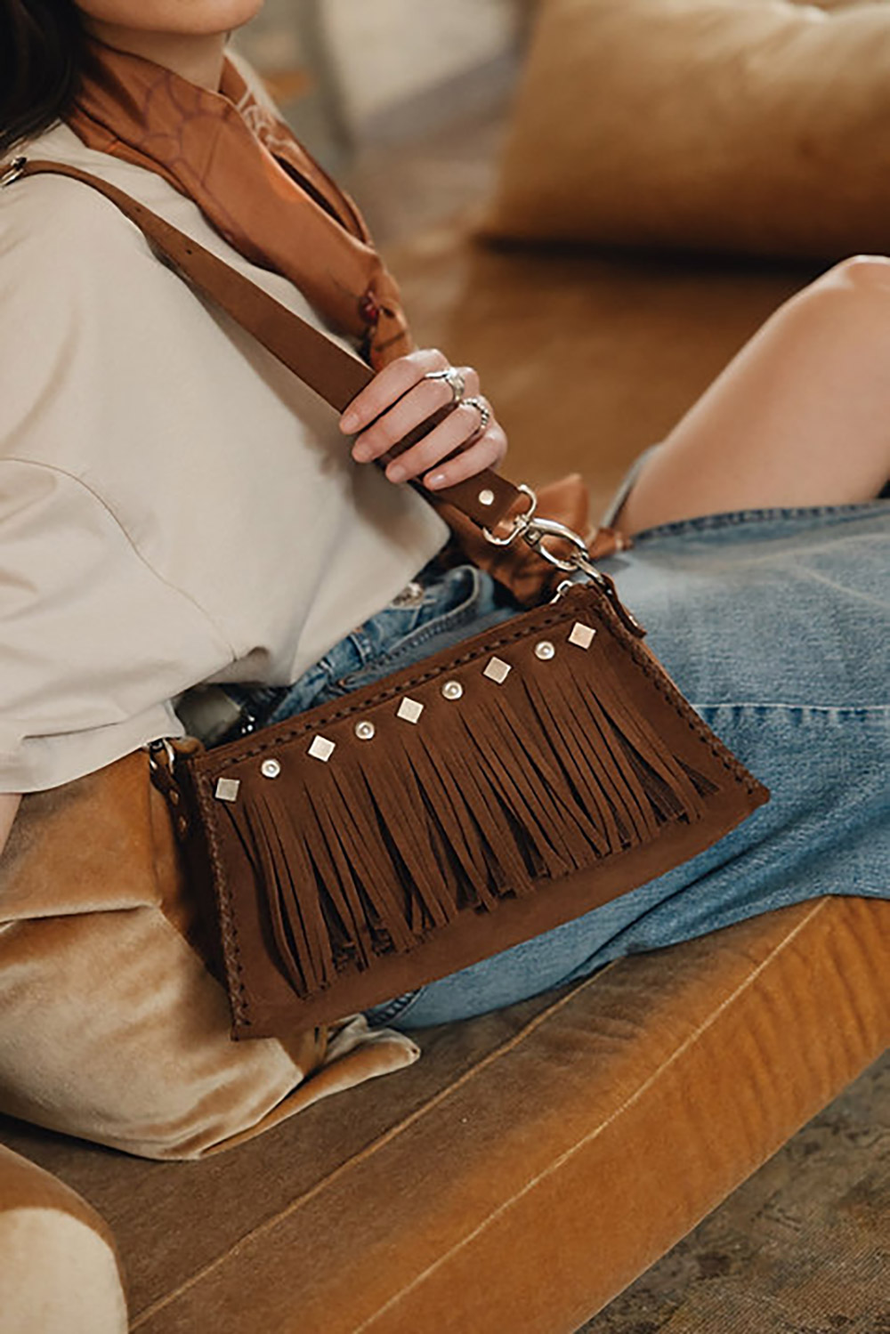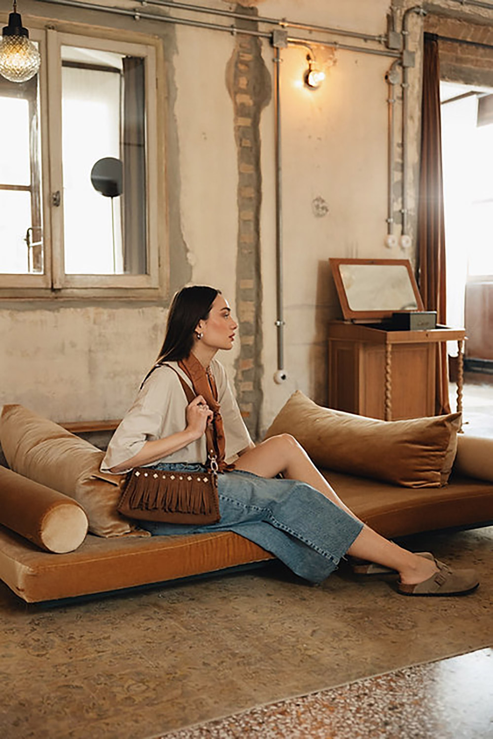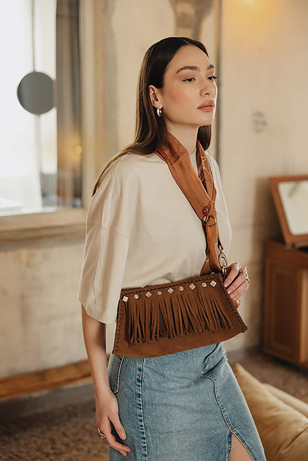 Handcrafted leather shoulder bag with carved gold or silver metal details / Comes with two straps (one leather, one chain) / Contains removable leather wallet