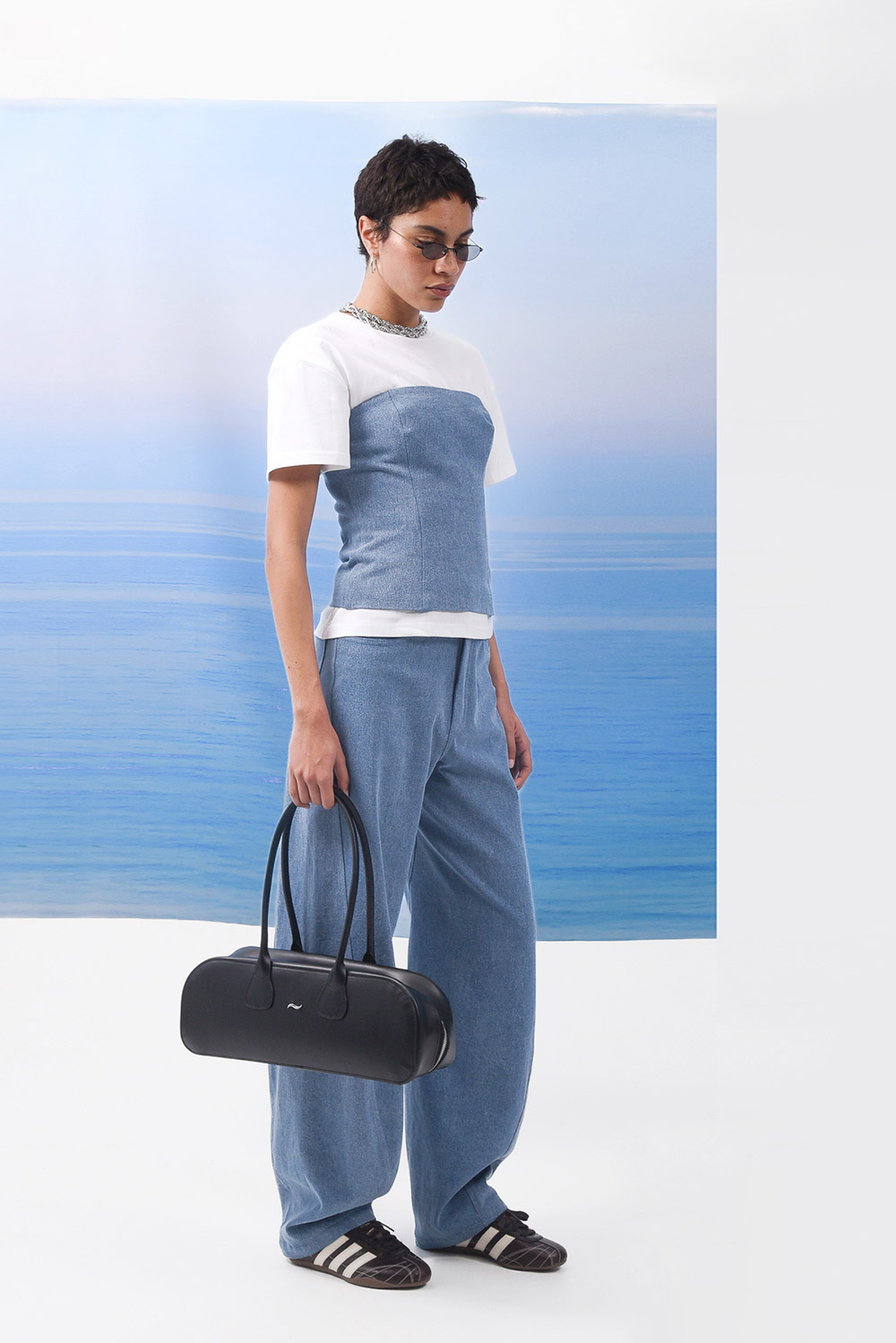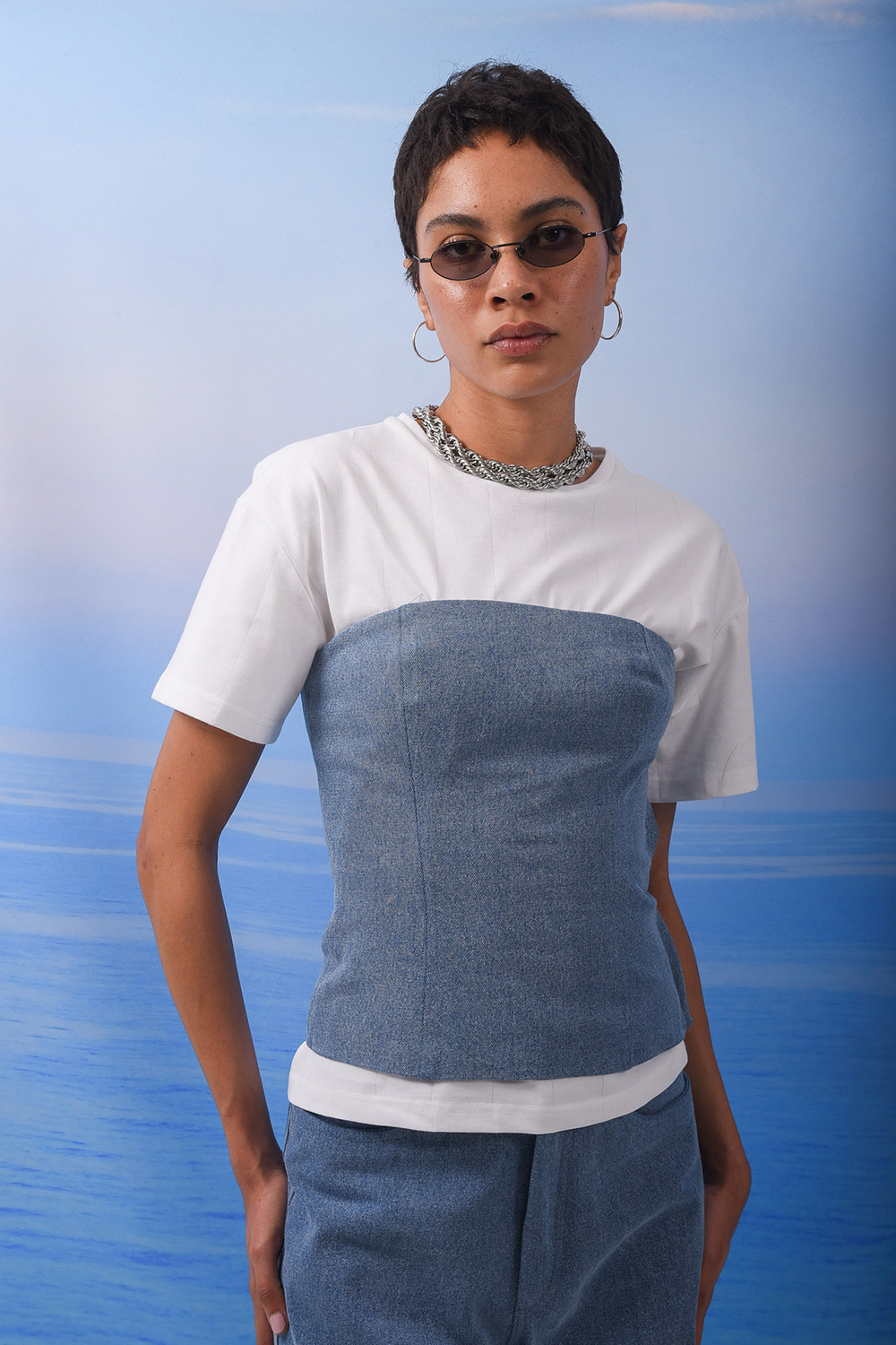 Strapless, denim corset / Sculpted silhouette / Adjustable lace-up back