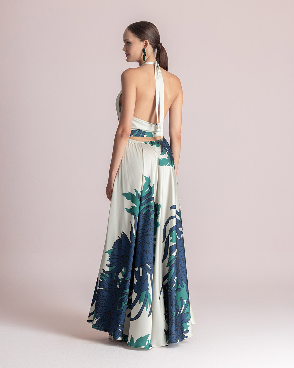Maxi, printed, backless dress / Ties on the neck / Side zip closure / Elasticated at the back