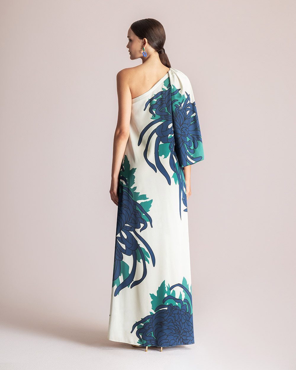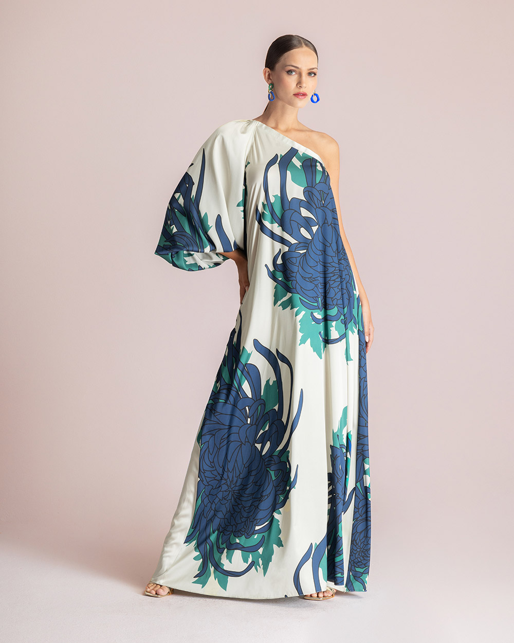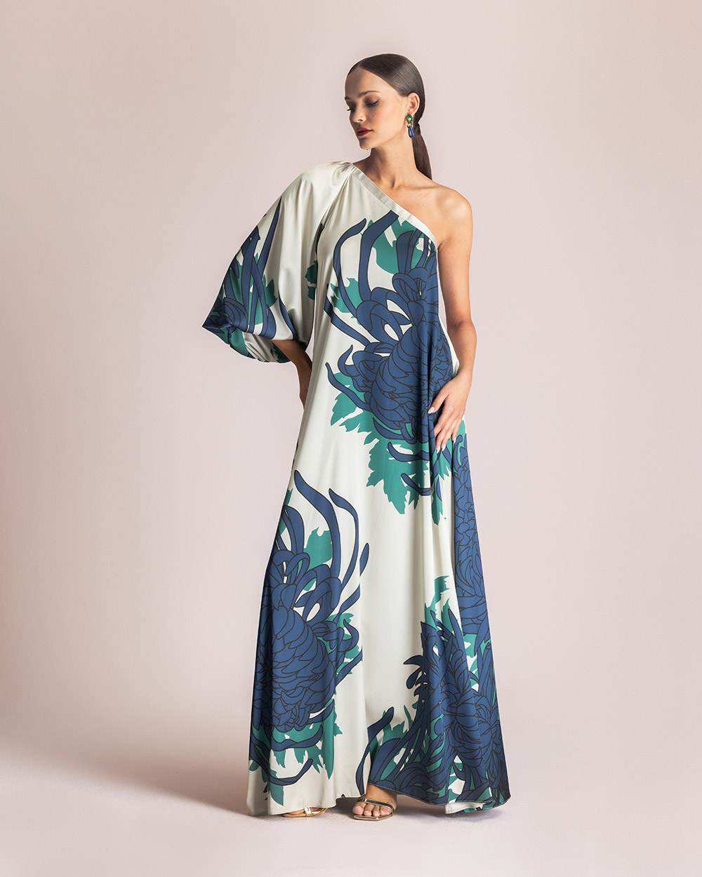 One-shoulder, printed, maxi dress / Belt included / Side zip closure / Comfy fit