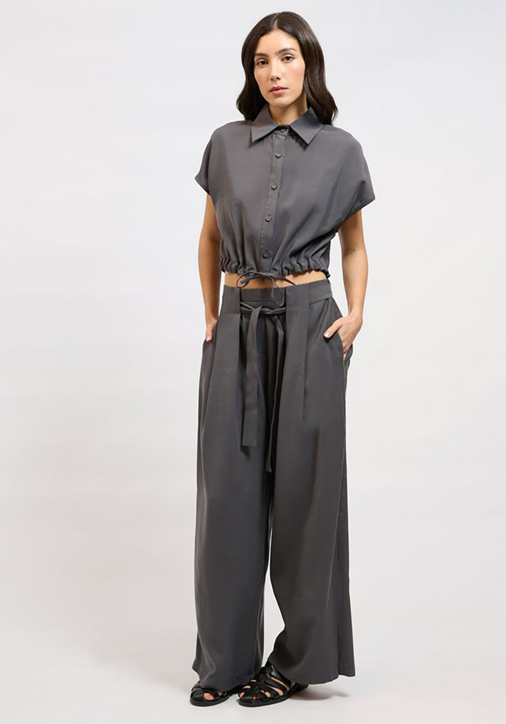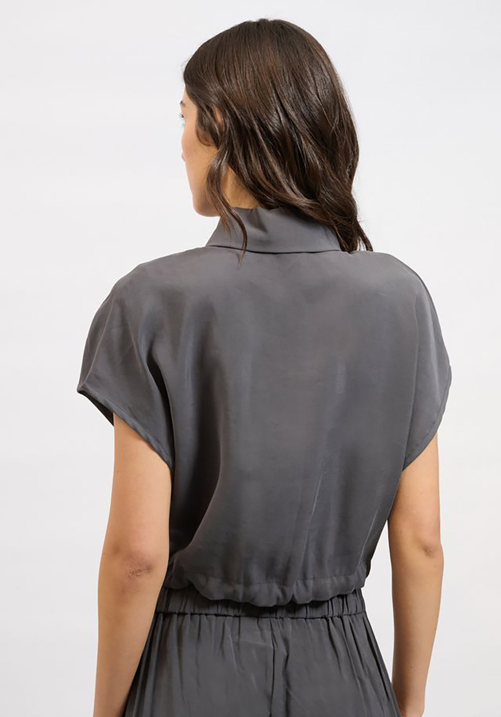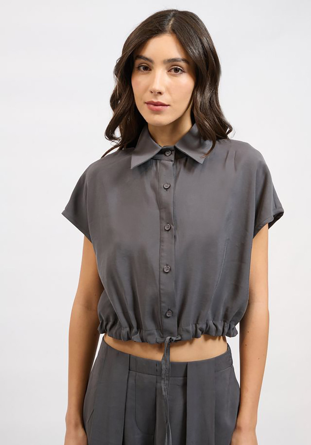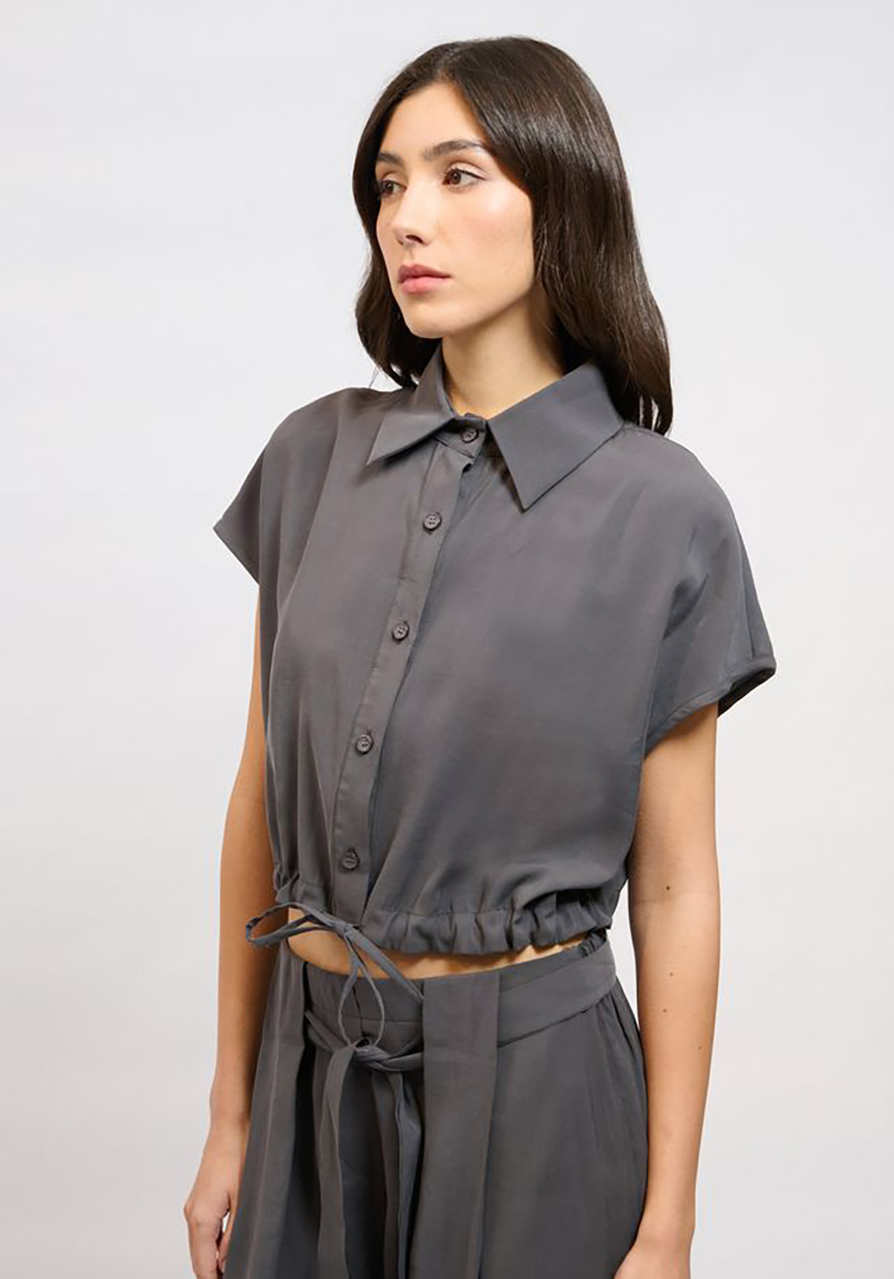 Cropped, button-up shirt / Drawstring waist / Adjustable fit / Short sleeves
