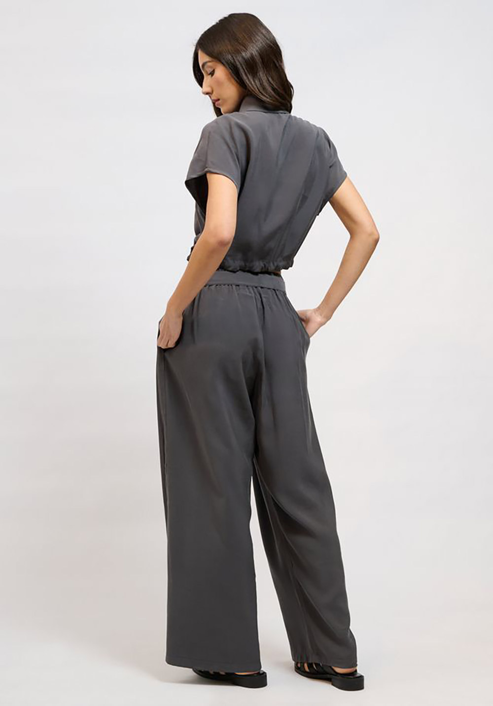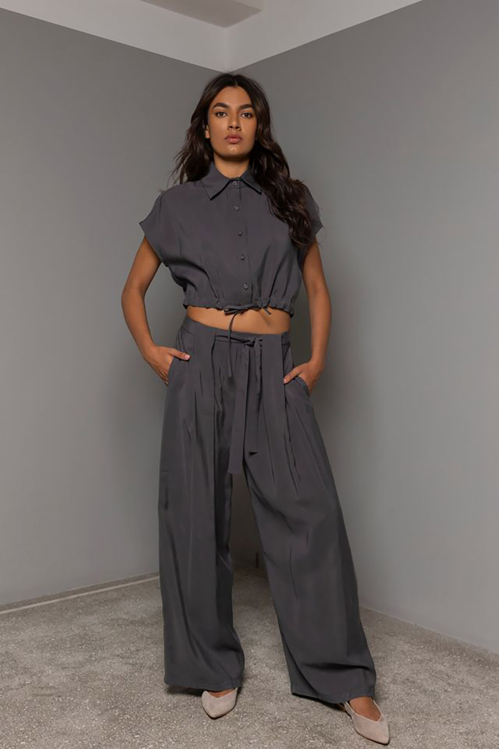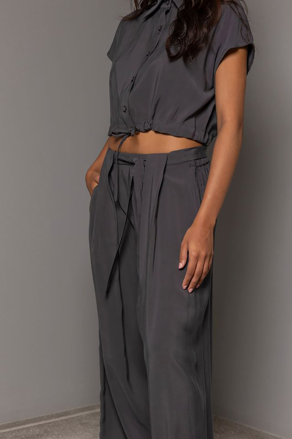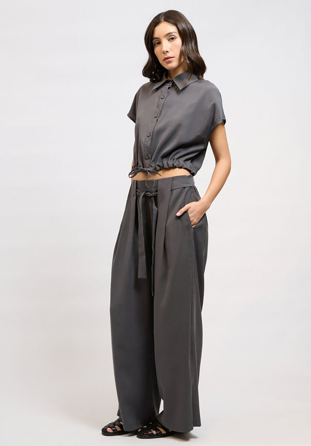 Cropped, button-up shirt / Drawstring waist / Adjustable fit / Short sleeves