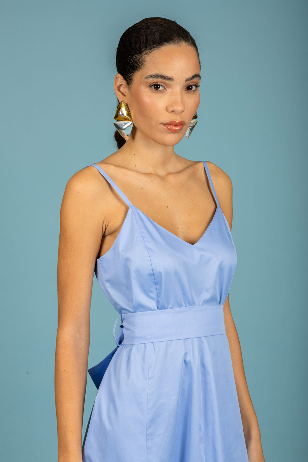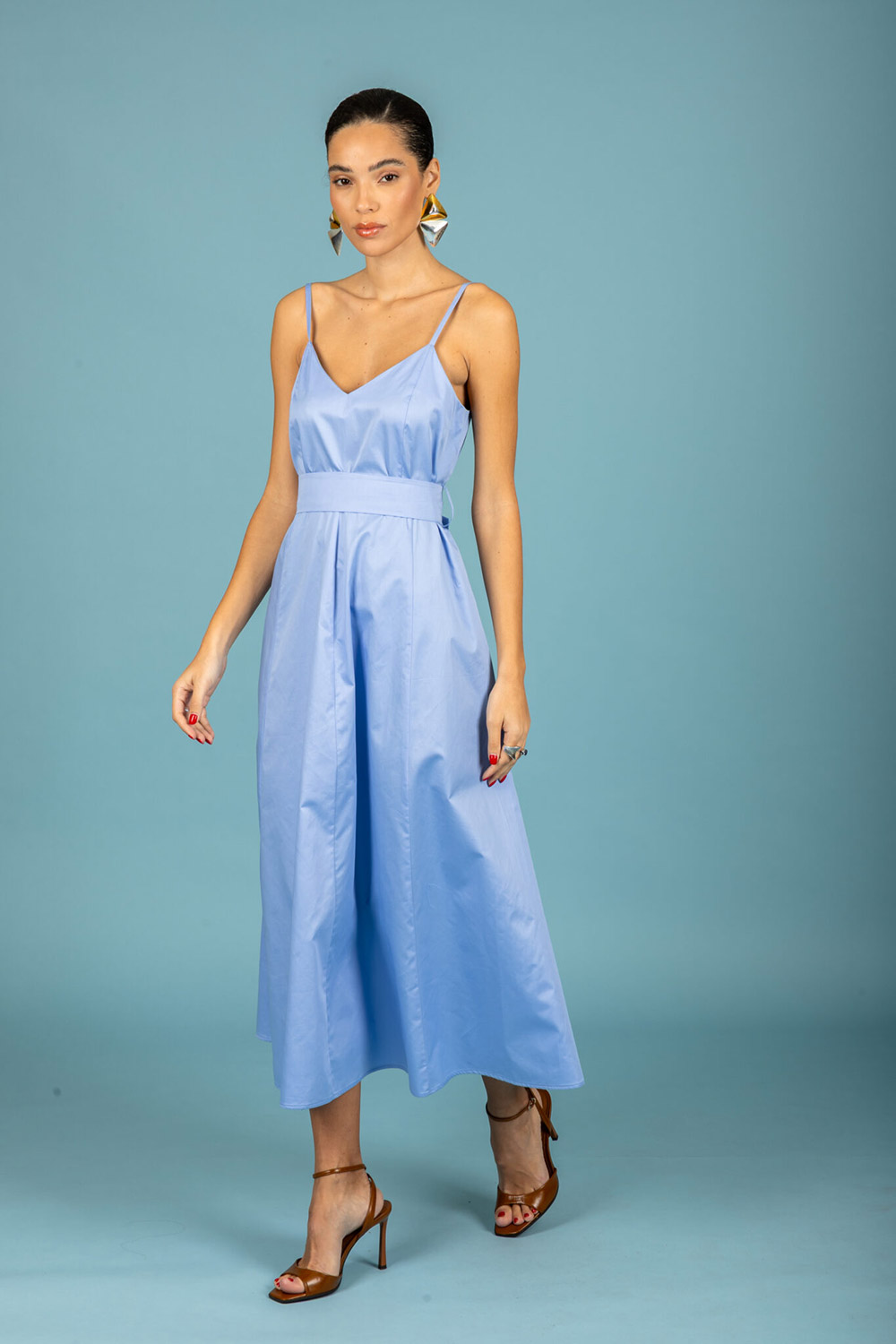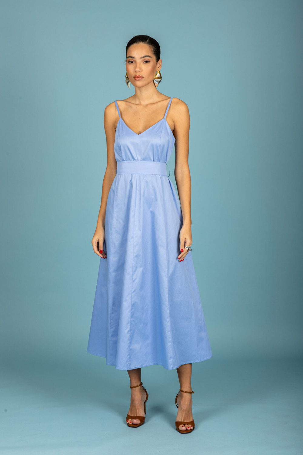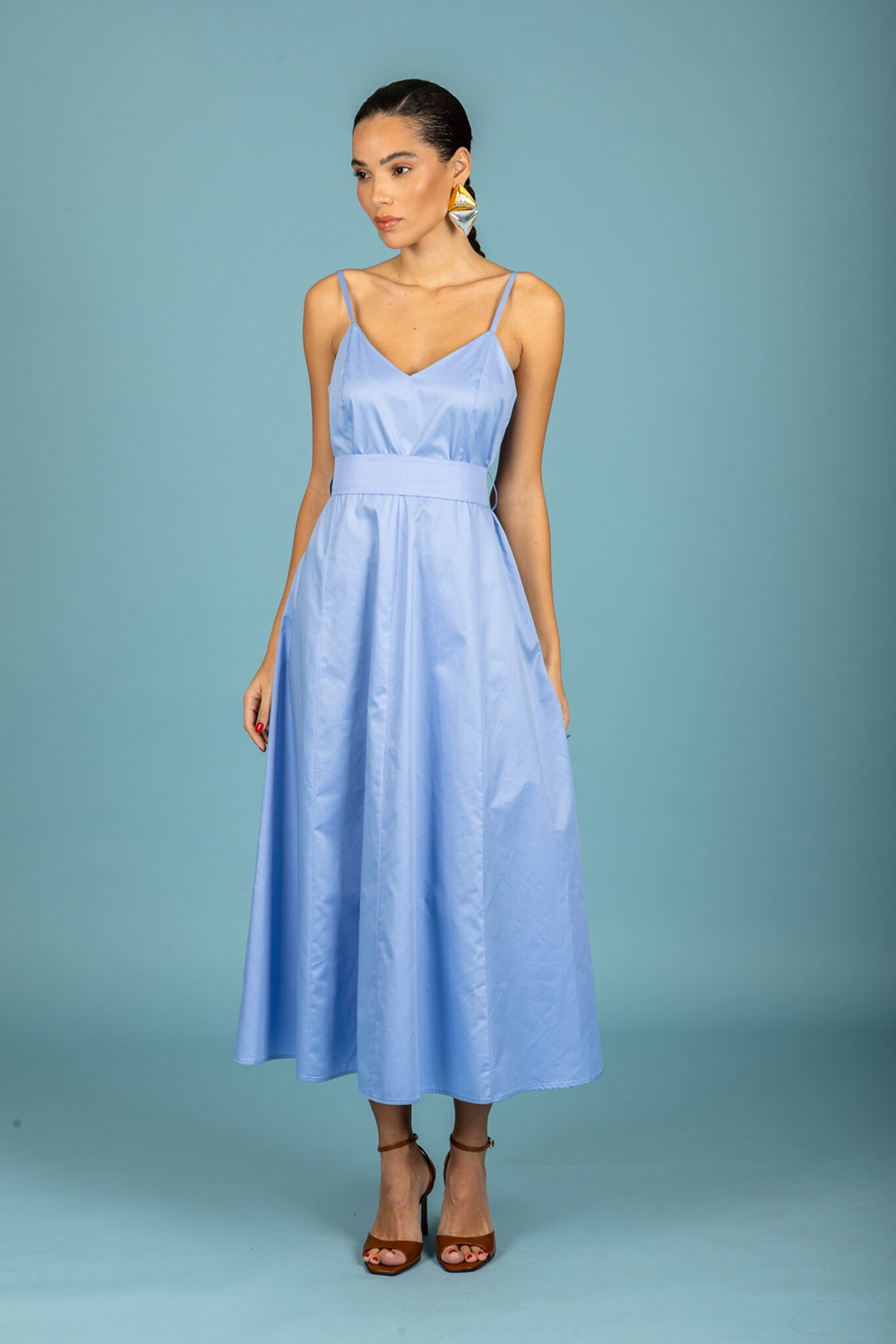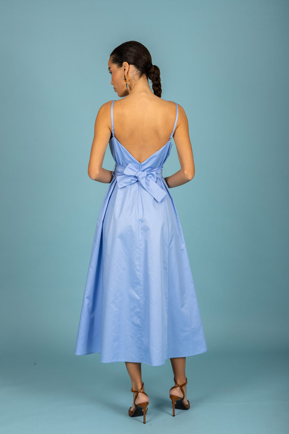 Midi, backless dress / A-line / Deep V-neck / Thin straps / Belt included