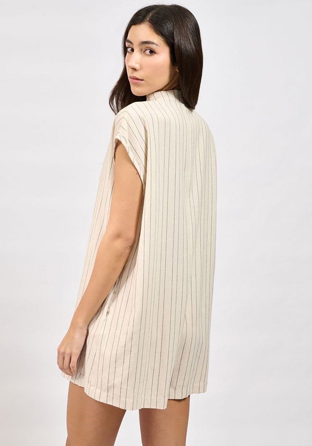 Loose, short-sleeved, striped playsuit with vertical pinstripes / Front button closure / Side pockets