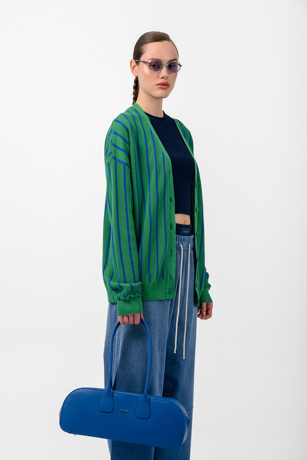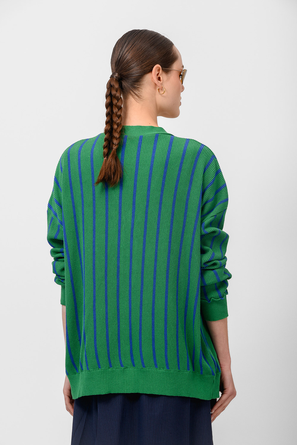 Relaxed fit, ribbed knit cardigan with vertical stripes / Deep V-neck / Button front and dropped shoulders / Unisex