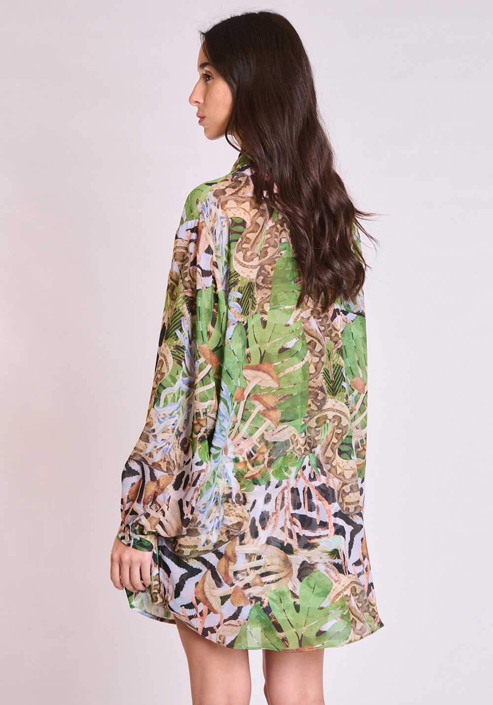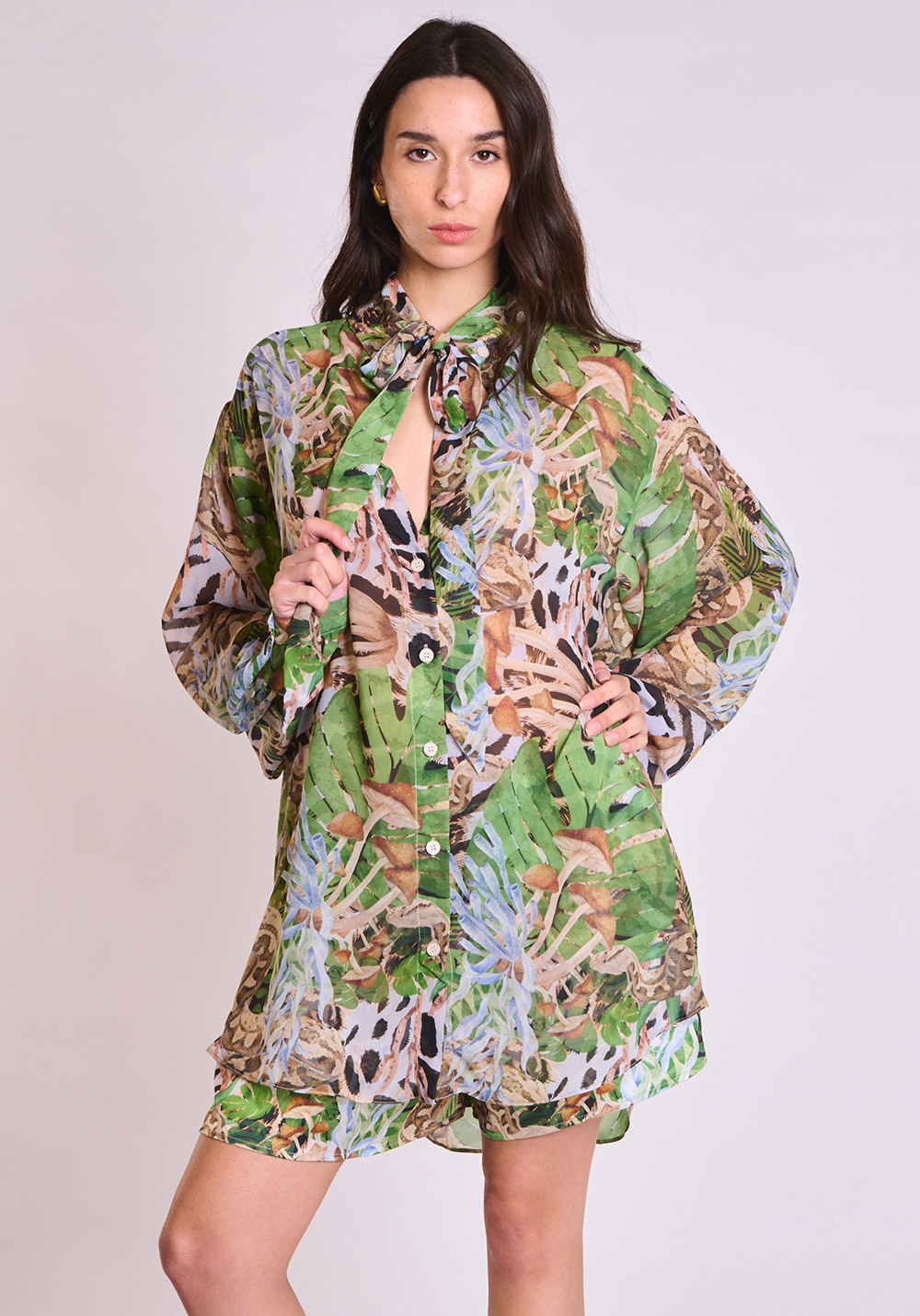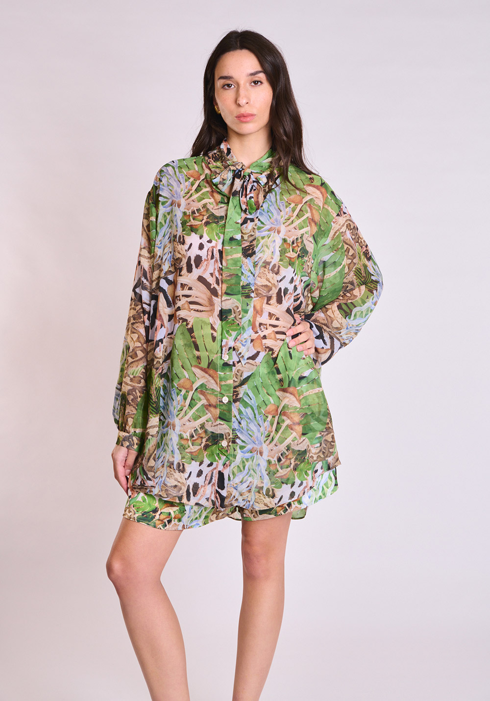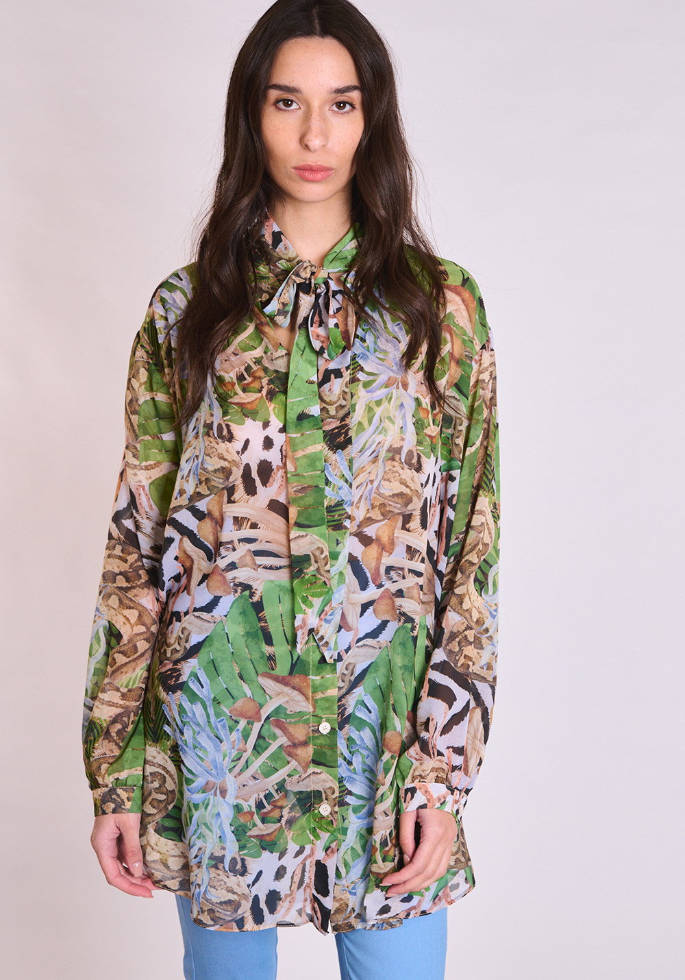 Printed, transparent, long-sleeve shirt / High-neck design with an exaggerated bow tie / Relaxed fit