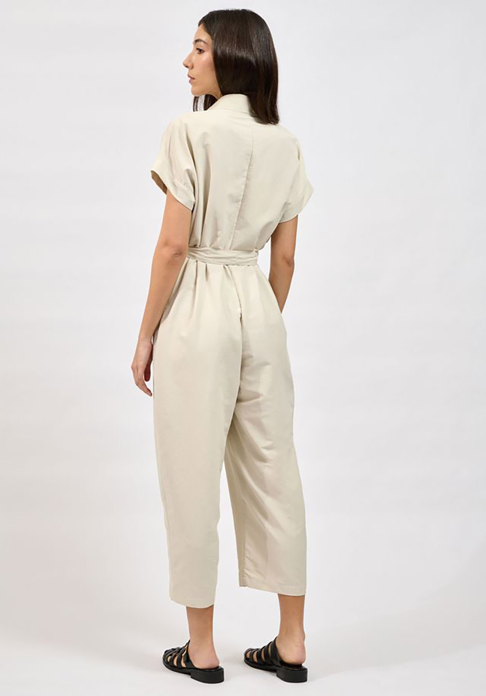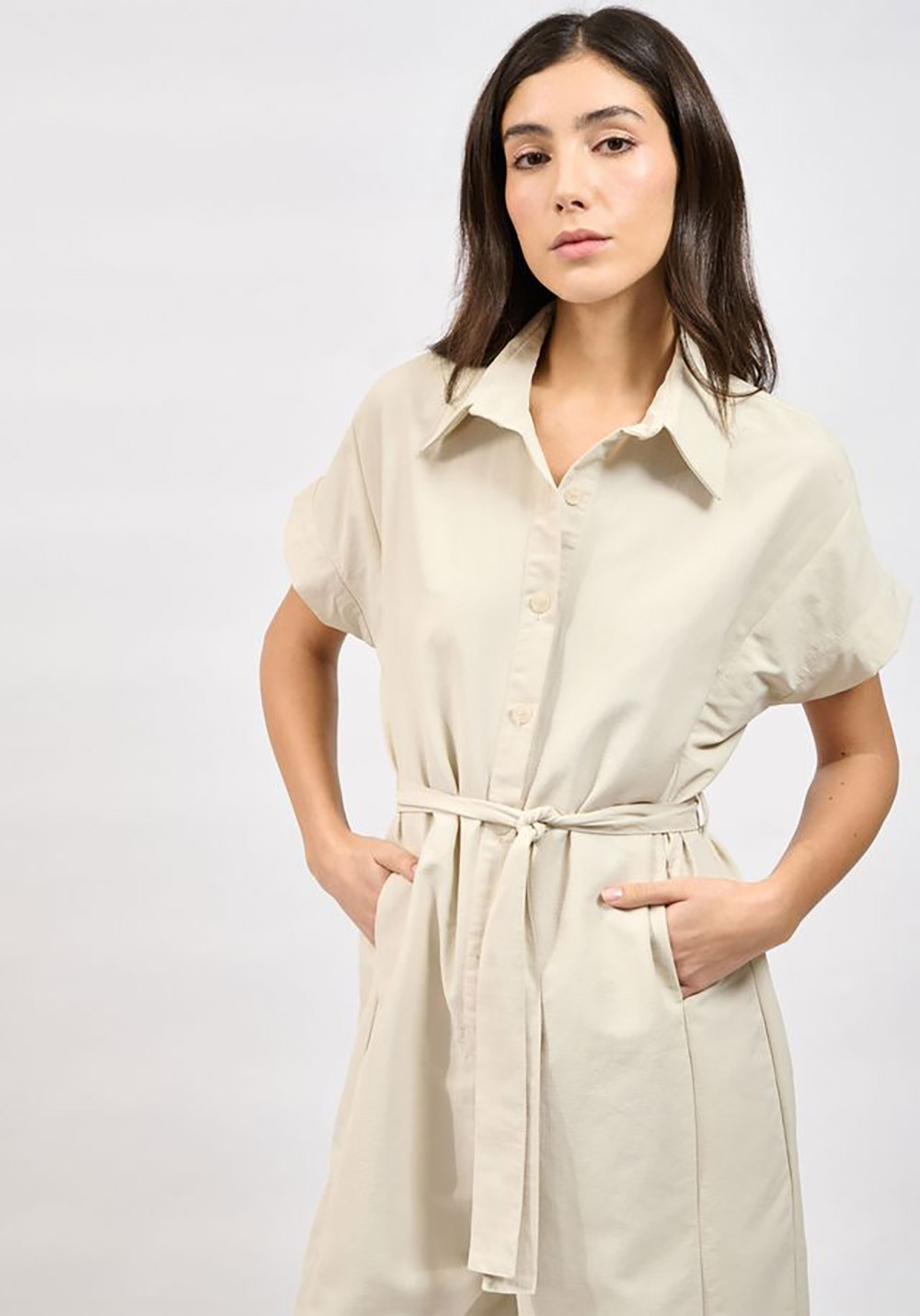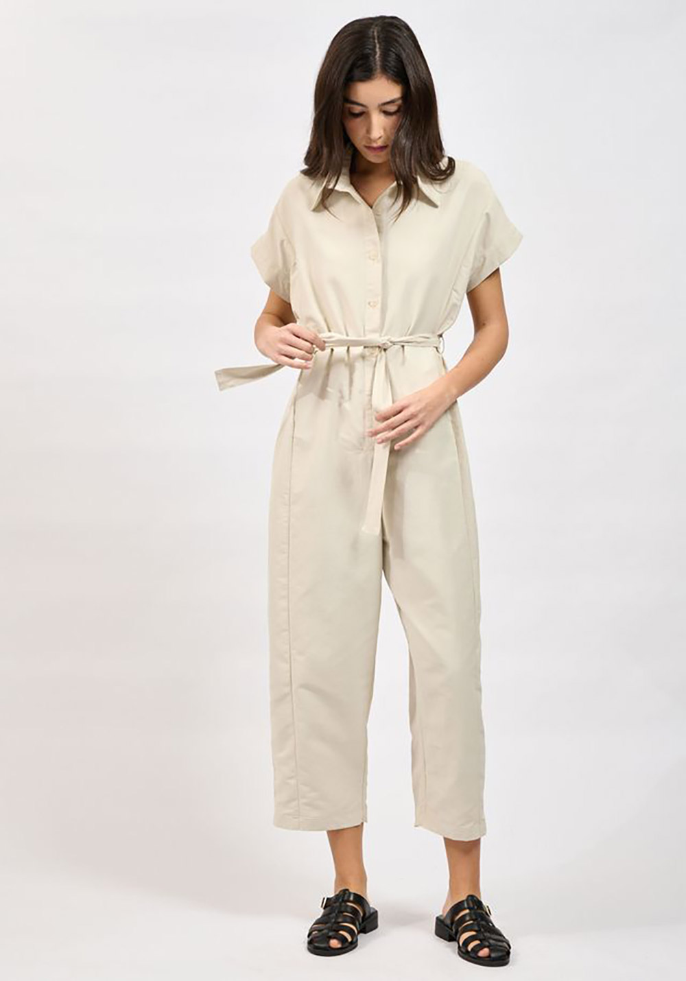 Short-sleeve, wide-legged, cropped jumpsuit / Classic shirt collar / Front button fastening / Adjustable self-tie belt at waist / Side pockets