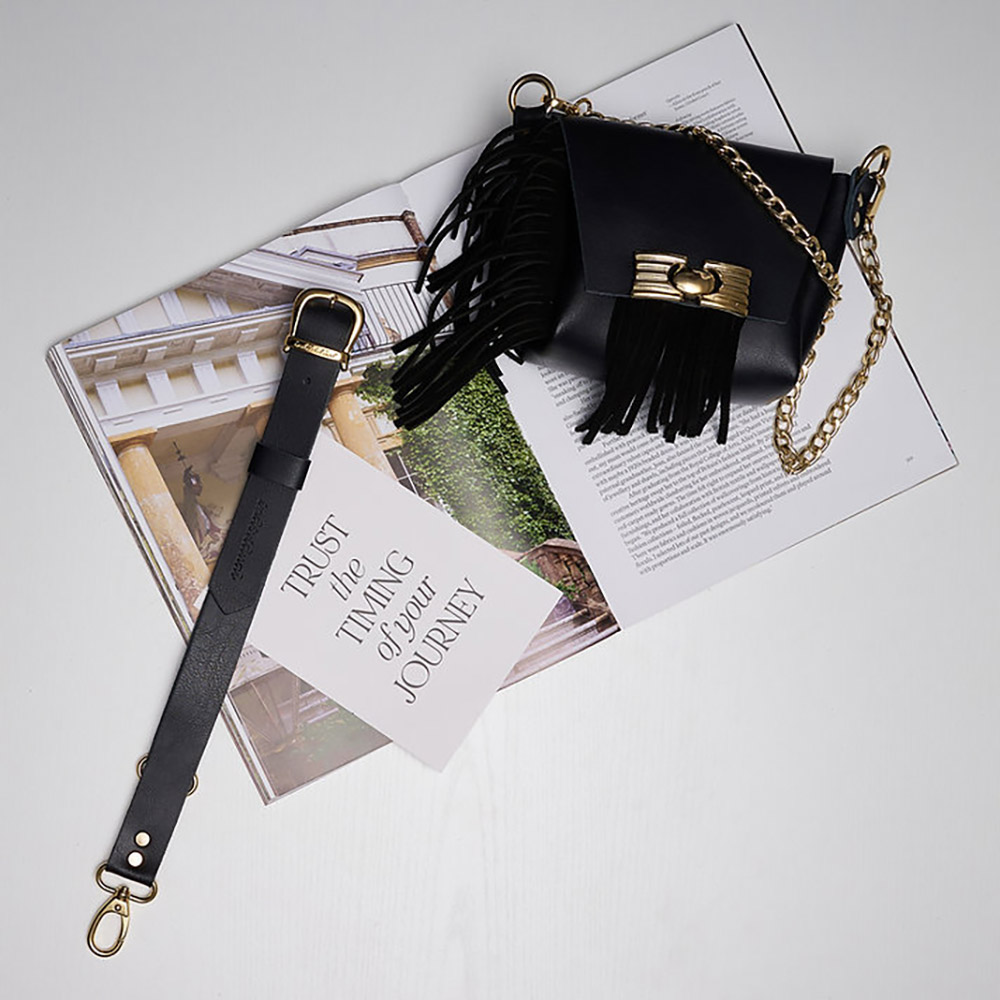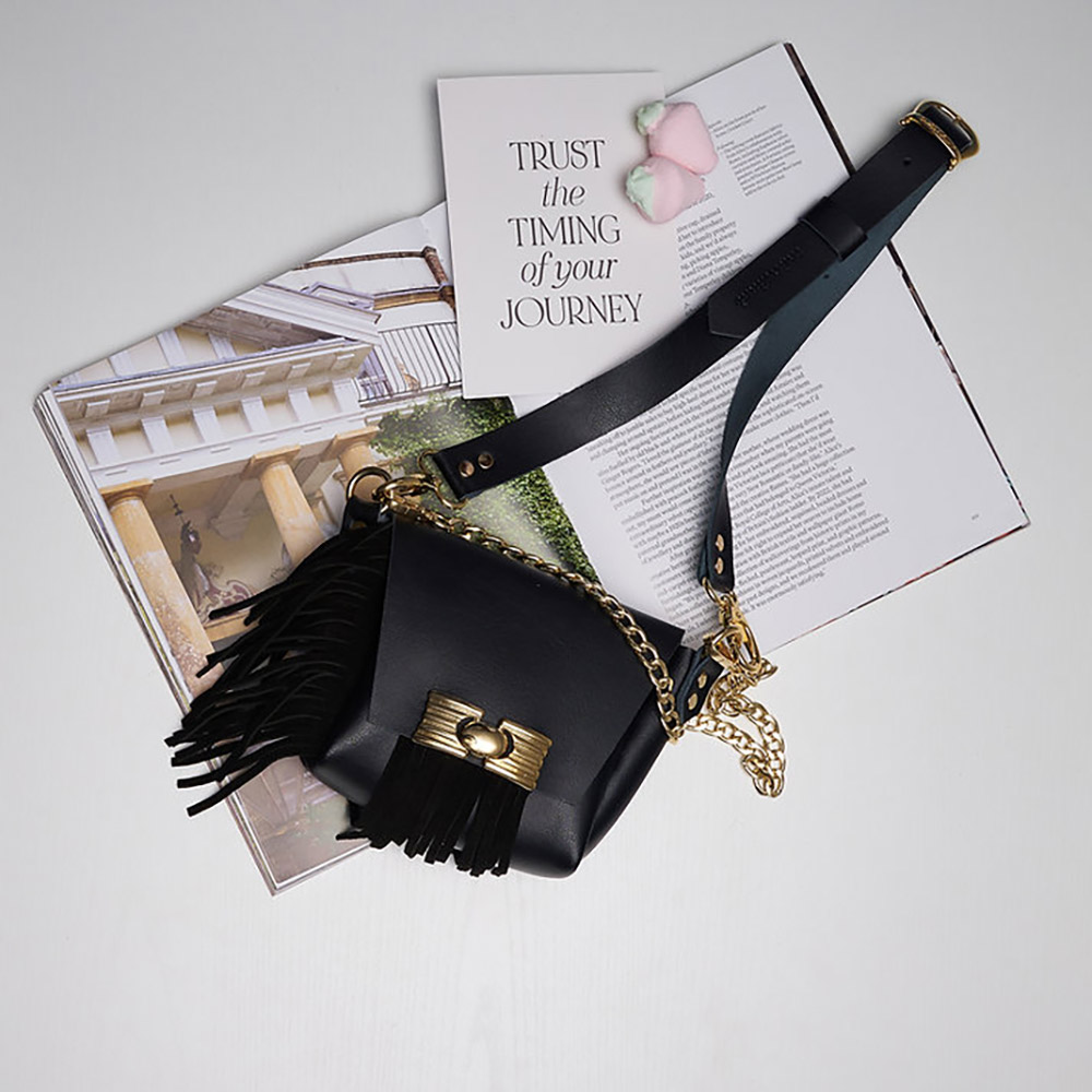 Handcrafted leather small shoulder bag with carved gold or silver metal details / Comes with two straps (one leather, one chain) / Can be worn as a clutch